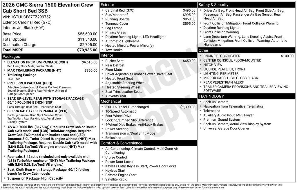 2026 GMC Sierra 1500 Elevation Price includes: $1750 - Purchase Allowance. Exp. 03/31/2026 $500 - Bonus Cash. Exp. 03/31/2026